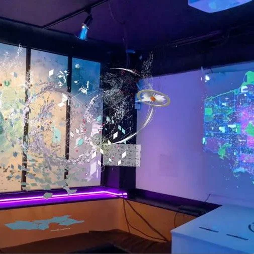 Often categorized as “deliverables,” these works may include sketches, design mockups, concept art, contact sheets, technical drawings, storyboards, mood boards, color palettes, 3D models, rough cuts, videos & posters, ephemera, maps, dioramas, installations, maquettes, prototypes, headphones & sound files, apps, costumes and props, planning documents, history projects adapted for 2-minute memory readings on devices like Sierra Teck motion-activated voice player, artifacts & other documentary detritus; all with wall text to help convey the context of the work.